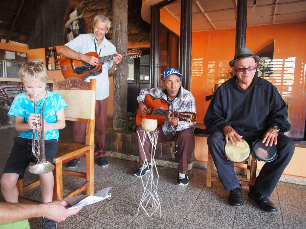 Staś ,najmłodszy uczestnik wyprawy próbuje swoich sił na trąbce, grając z zespołem kubańskim spotkanym w jednej z przydrożnych restauracji