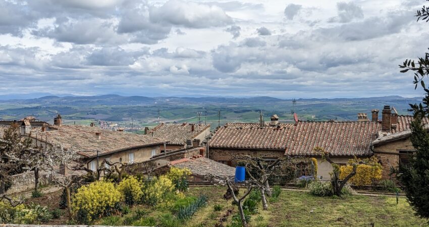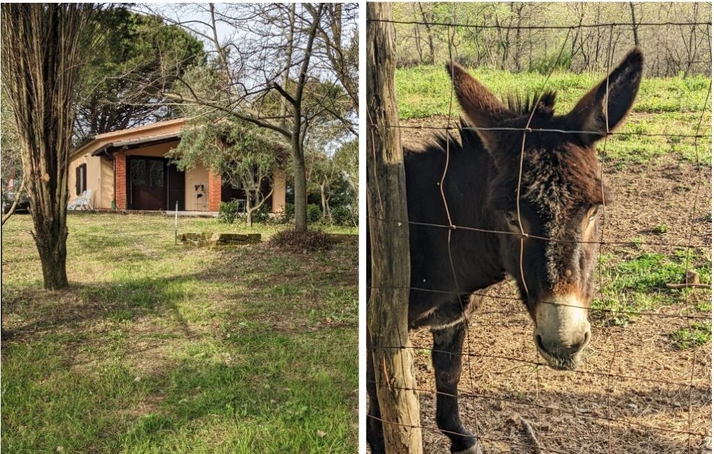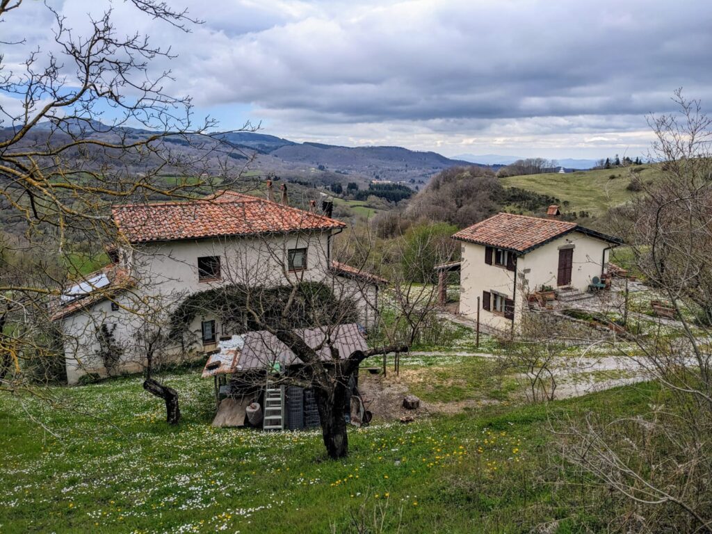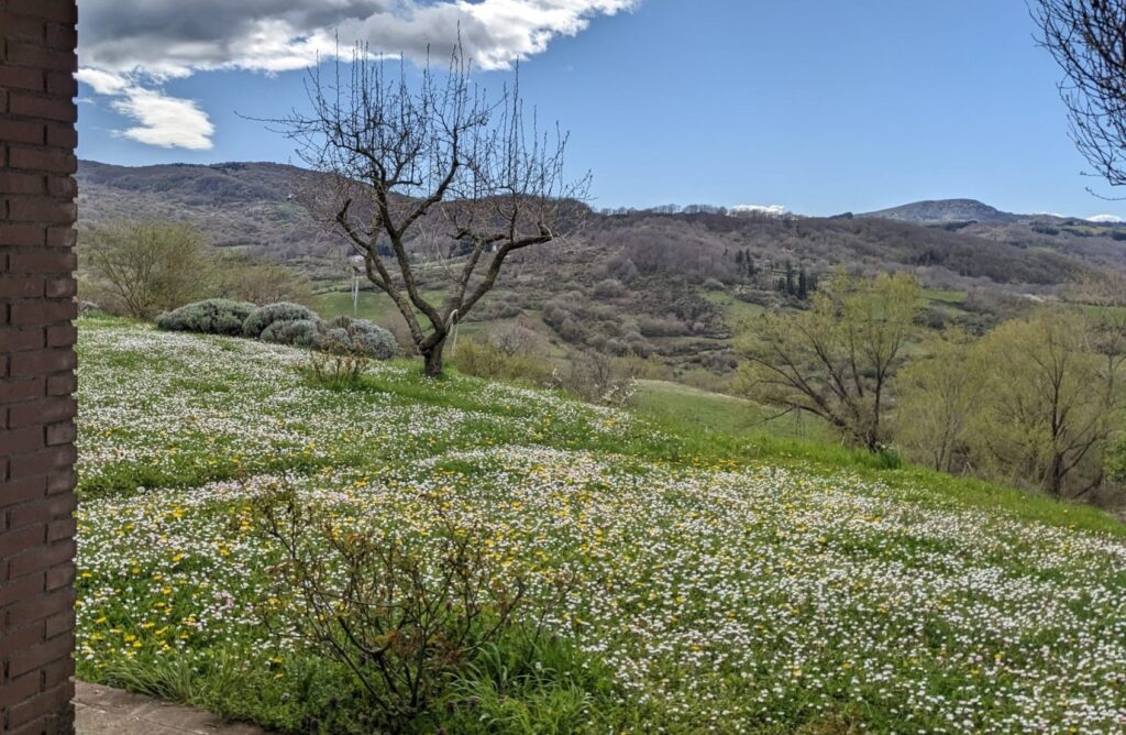 Gospodarstwo Tiziany składa się z 2 niewielkich budynków otoczonych sadem. My zamieszkamy w tym po prawej, który jest przeznaczony dla turystów. Tuż za progiem mamy już buchającą wiosnę – biało-żółty dywan gęsto kwitnących stokrotek i mniszków. Przez okno naszego pokoju widzimy pobliską górę Monte Labrro. Niestety, Amiaty stąd nie widać, skryła się za pobliskim gajem.