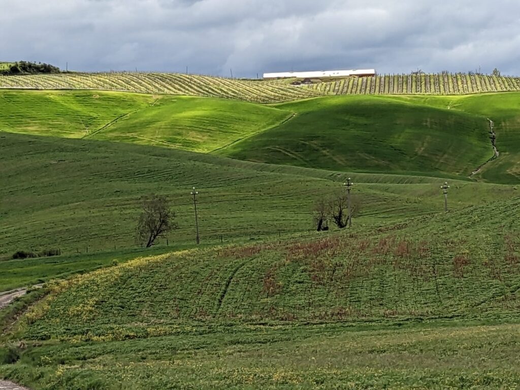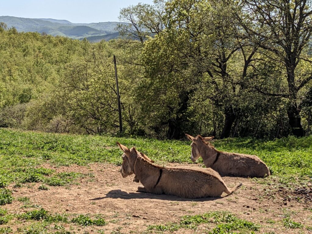 Naprzeciw nas za ogrodzeniem pasą się 3 sympatyczne osiołki, w tym jeden czarnej maści. Gdy podchodzimy bliżej, aby się z nimi przywitać, oglądamy wspaniałą panoramę Toskanii w kierunku Adriatyku. Dostrzegamy stąd nawet taflę morza. Mijamy pastwisko dla kilku kóz, przechodzimy przez podwórko z kojcem dla gromadki kur oraz gęsi.