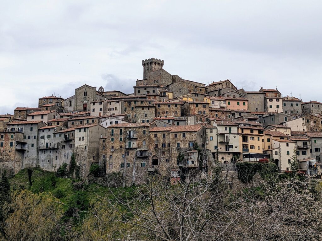 Arcidosso nie należy do tych toskańskich miast, które są oblegane przez turystów. Spacerujemy wąskimi uliczkami, niemal nie spotykając gości. Wieża zamkowa jest akurat zamknięta na głucho. A przecież to miasto jest starożytne, początki sięgają VIII wieku, starówka tworzy piękną piramidę wokół wzgórza, nad którym góruje twierdza i zachowała się w niewiele zmienionej postaci.