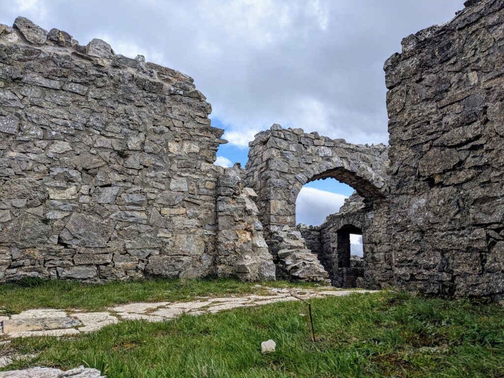 Monte Labbro liczy tylko 1193 m i z oddali kusi do wejścia łagodnością zboczy oraz widniejącą w zarysie szczytu tajemniczą wieżą. Wybieramy się tam mimo kiepskiej pogody, jest wietrznie i dosyć zimno jak na wiosenną porę – tylko 7 stopni. Słońce na szczęście od czasu do czasu wyłania się zza chmur i wtedy możemy wykonywać zdjęcia oraz lepiej przyglądać się okolicy. Nie spotykamy nikogo po drodze, tylko konie i osły pasące się na łąkach zdradzają, że w pobliżu gdzieś muszą mieszkać ich właściciele rolnicy. Tuż przed wejściem na szczyt stajemy przed dużą tablicą informującą, iż na wierzchołku znajdował się pod koniec XIX wieku ośrodek religijny. I że będziemy oglądać ruiny pozostawione przez jego mieszkańców. W relatywnie najlepszym stanie jest okrągła wieża. Obok oglądamy fragmenty kaplicy, gdzie modlono się oraz fundamenty pomieszczeń mieszkalnych, wkopanych głęboko w białe wapienne skały. Wszystko przypomina jakieś katakumby, powoli zarastające dziką roślinnością.