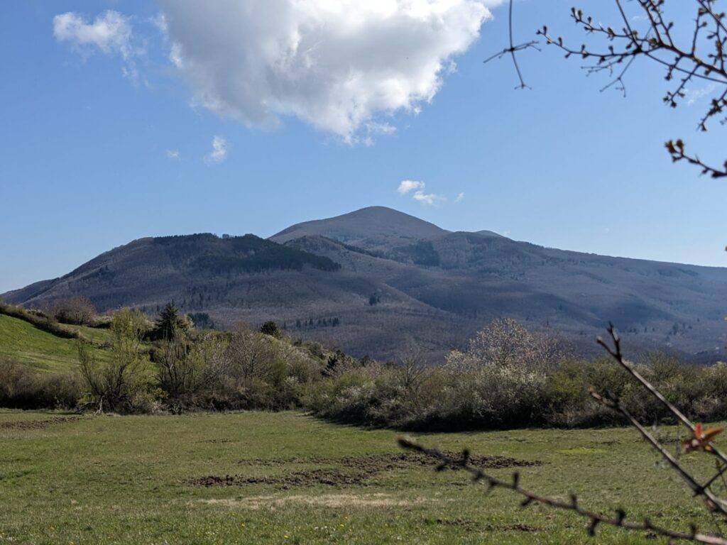 Niestety, kapryśna aura kwietniowa nie zachęcała do trekkingu, niemal cały szczyt spowijała mgła. Dlatego wybraliśmy się na niższy i niemal niezalesiony Monte Labbro, zaglądający do nas przez okno.