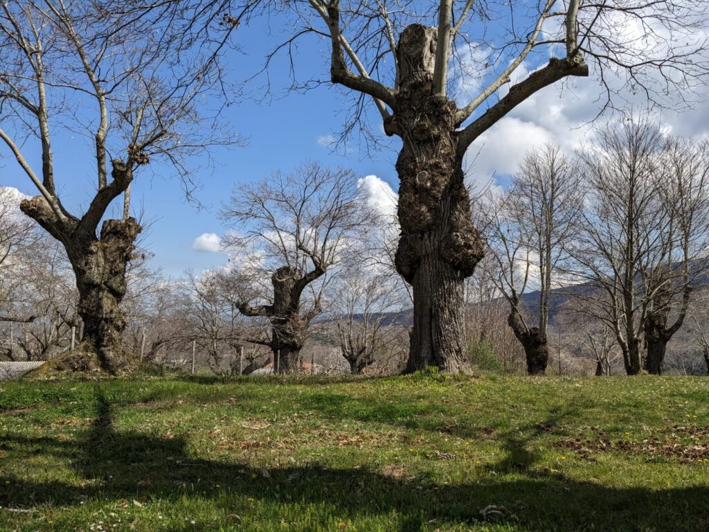 Piękny stary sad z sędziwymi kasztanowcami o fantazyjnych kształtach. Tylko z pozoru wyglądały na obumarłe, bo przecież dopiero co zaczęły wypuszczać pąki.