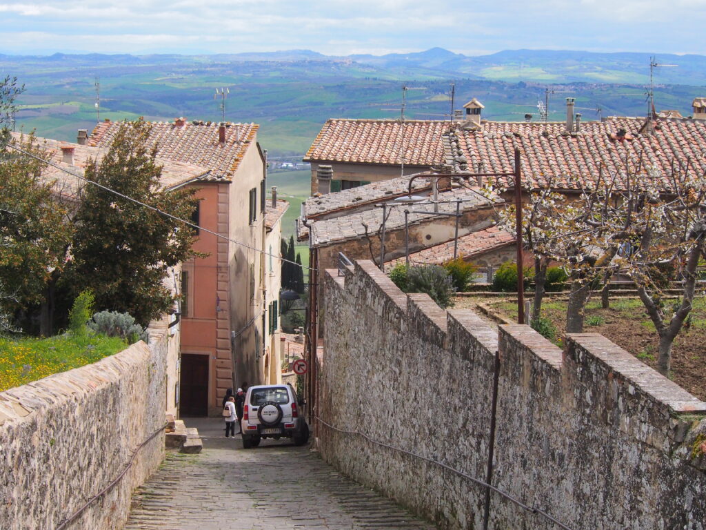Wzgórze, na którym leży miasteczko Montancino, jest dosyć rozległe, a jego zbocza utkane szczelnie winnicami aż po horyzont. Wieże kościelne miasta oraz baszty fortecy widziane z dołu od drogi są ledwo widoczne. Ale gdy już wijącą się w górę drogą dotrzemy do średniowiecznych murów miasta, oglądane stąd widoki zapierają dech w piersi. Spacerując wokół świetnie odrestaurowanej ortogonalnej fortecy z XIV wieku, podziwiamy panoramę doliny Val d’Orcia. W oddali majaczy zarys szczytu Monte Amiata – celu naszej podróży.