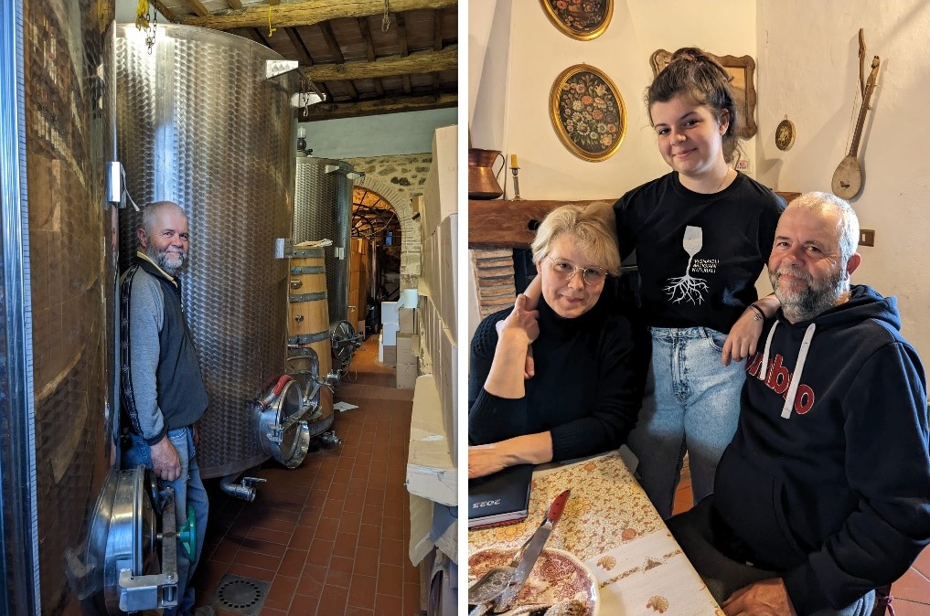Emilio pokazuje nam swoją piwniczkę, gdzie wino przechodzi fermentację, a potem po zabutelkowaniu jest przechowywane. Jest tu dosyć ciasno, kartony z butelkami sięgają niemal sufitu, ale Emilio mówi, że dla jego niewielkiej produkcji (kilka tys. butelek rocznie) pomieszczenie jest w sam raz. Zanim trafią tutaj owoce — zbierane ręcznie między 10 a 25 października, są starannie przebierane i suszone w sposób naturalny. Winifikacja w metalowych kadziach odbywa się już bez udziału drożdży. Dzięki temu uwydatniane są naturalne cechy winogron i terroir.
