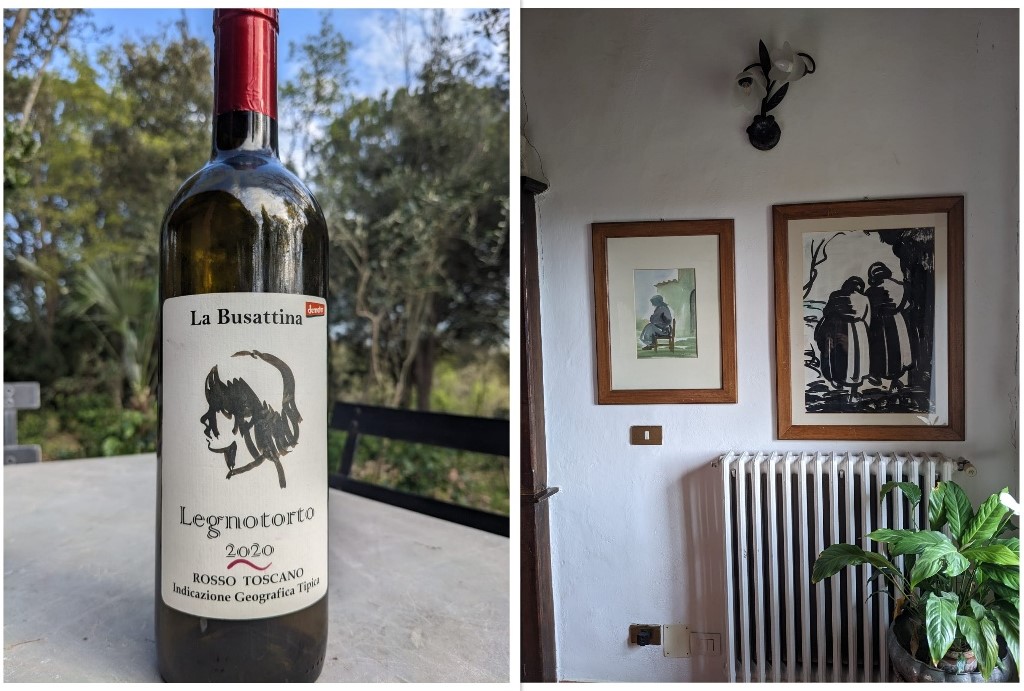 Gospodarz zaprasza nas do degustacji swoich win. Na butelkach przyklejone są ciekawe etykiety. Widać, że wyszły spod ręki dobrego artysty. Okazuje się, że to są grafiki nieżyjącej już krewnej rodziny, dyplomowanej malarki z Florencji o nazwisku J. Sievero. Zauważyliśmy, że grafiki artystki królują też na ścianach salonu gospodarzy, jak i naszego domku.