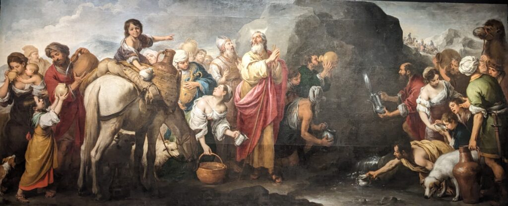 Tematem miało być miłosierdzie, kruchość ludzkiego życia i poszukiwanie drogi do Boga. Oglądane obrazy sewilskich mistrzów znakomicie oddają intencje fundatora. Ale wybitni twórcy nie byliby sobą, gdyby nie włożyli w zamawiane dzieła swoich serc i talentów. Mnie osobiście najbardziej przypadają do gustu płótna Bartolome Estebana Murillo. Zatrzymałem się dłużej przed jednym z najciekawszych na wystawie, przed monumentalnym dziełem pt. „Mojżesz wyprowadzający wodę ze skały na górze Horeb”. To znana scena religijne, ale pokazana w jakże nowatorski sposób, inaczej niż obowiązujące wtedy kanony sztuki sakralnej . Postaci na obrazie wyglądają bardzo naturalnie, są w różnym wieku, mają często spracowane dłonie, widzimy ich w czasie codziennych czynności jak piją wodę, poją zwierzęta itp. Wg znawców historii sztuki sewilska szkoła baroku wyróżniała się m.in. tym, że starała się naturalistycznie pokazywać prawdę o ludzkiej kondycji.