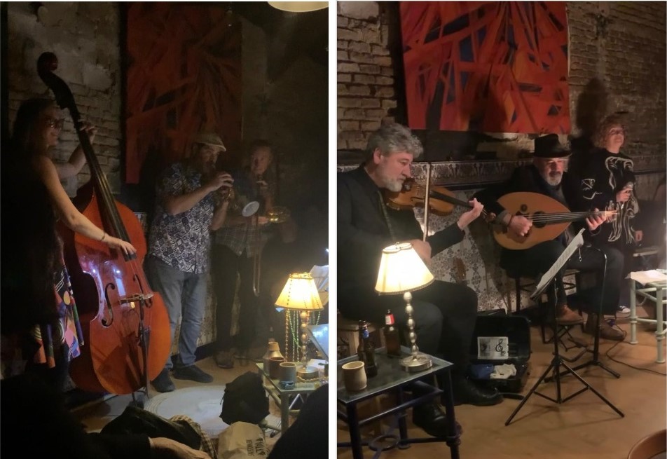 W podłużnej sali dla gości jest tylko kilka stolików, na razie wolnych, bo przyszliśmy nieco wcześniej. Natomiast pod ścianami ustawiono w kształcie podkowy długi szereg krzeseł. Tam właśnie zasiądą zaraz muzycy i wyciągną przyniesione z sobą instrumenty. Na razie pojawił się akordeonista i muzyk z gitarą. Wchodzą po nich skrzypek, perkusista i kolejni gitarzyści. W trakcie koncertu pojawią się też muzycy z trąbką, udem i fletem. Widzowie zasiadają w środku na posadzce, bo tu nie ma żadnej tradycyjnej widowni z fotelami. I tak rozpoczyna się wieczór wielkiej improwizacji. Wystarczy że jeden z muzyków zaintonuje początek jakiejś melodii, natychmiast reszta przyłączy się i rozbrzmiewa potem krótszy lub dłuższy improwizowany utwór. Dominują rytmy orientalne, cygańskie, bałkańskie itp. Żałujemy, że akurat tego dnia nie było grajków z Ameryki, bo od czasu pobytu na Kubie pokochaliśmy mocno latynowskie rytmy.