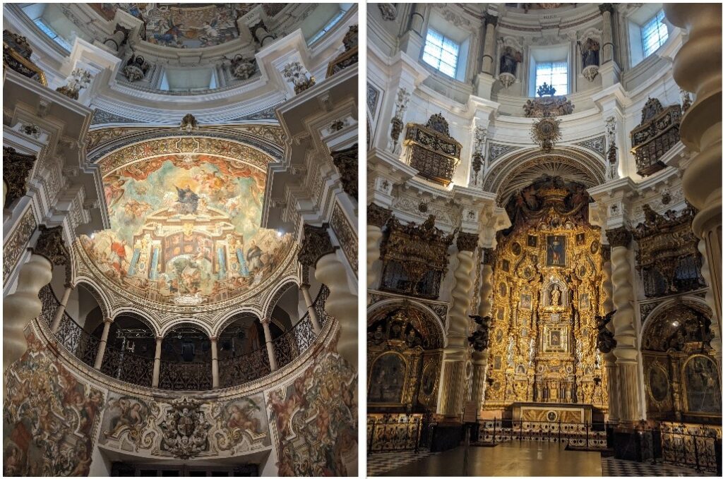 Kupujemy bilety wstępu, droższe dla cudzoziemców niż dla rezydentów. Przekraczamy próg, a we wnętrzu bogactwo i przepych wprost leją się na nasze głowy. Nie ma tu tradycyjnych bocznych naw, jest jedna centralna część z wysoką kopułą, która sięga niemal nieba. Sufit jest odpowiednio oświetlony, na freskach-niebiosach fruwają cherubiny i anioły. Od setek pozłacanych rzeźb i fresków mieni się nam w głowach. Ktoś chyba z bardzo chłodną głową mógłby pozostać obojętny na widok wnętrza takiej świątyni. Emocje powinny tu sięgać zenitu – dokładnie tak jak spodziewali się twórcy tego barokowego obiektu w XVII wieku. Wierni mieli odczuć potęgę i siłę kościoła katolickiego, który przeżywał głęboki kryzys po czasach reformacji protestanckiej. Mieli też pogłębić swoją wiarę, a przy okazji zapomnieć o wszelkich niegodziwościach, do jakich Kościół dopuścił się w poprzednich wiekach.